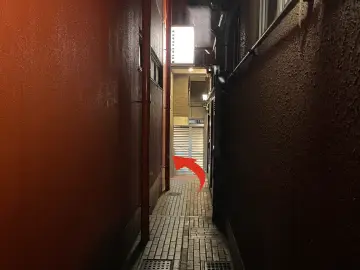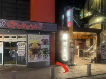 「はなまるうどん」を過ぎてすぐの路地(ビルの隙間)へ入り、奥の階段を降ります。さらに奥の突き当りに階段がありますが、M2(中2階)の他店舗様と間違えやすいのでご注意下さい。